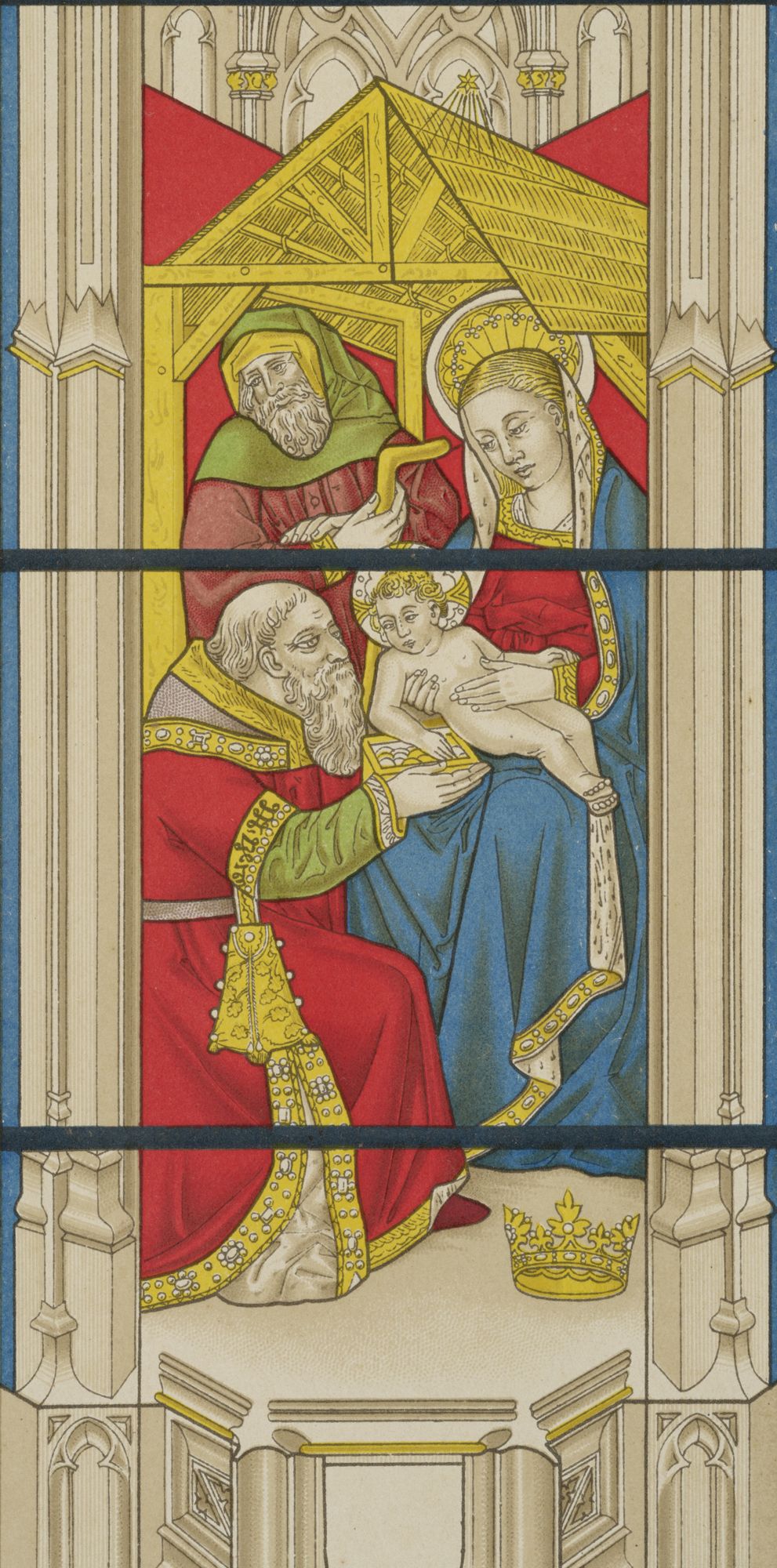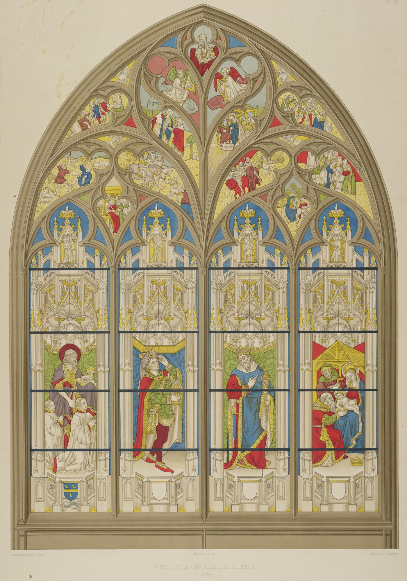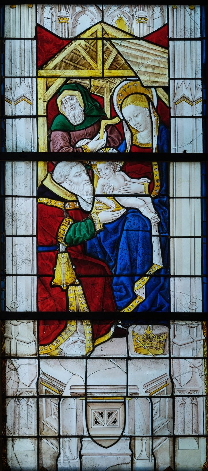 Trois panneaux représentant une partie de l’adoration des mages, vitrail de la chapelle Saint-Jean-Baptiste ou de Breuil